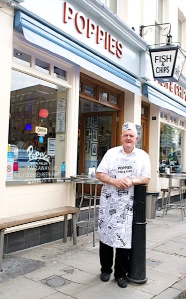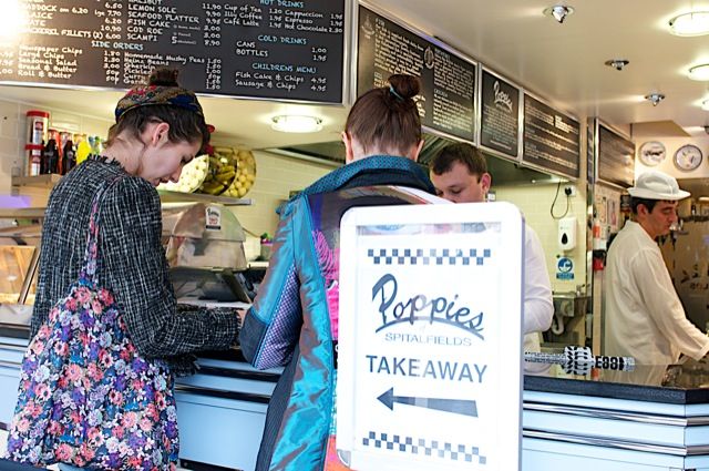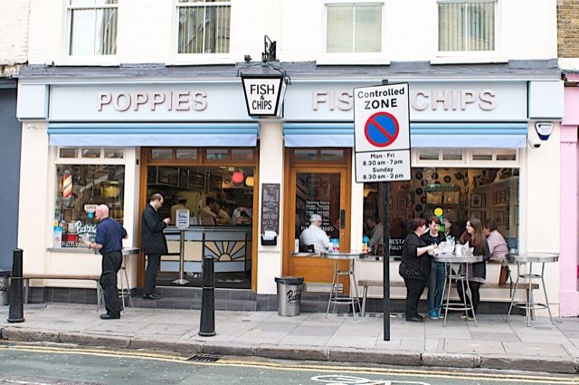 - Other information: You will soon discover that Poppies is more that just a fish bar. Pop has recreated East End London between 1945 and 1955. It was a time of rebirth: the end of the war, the return of our forces from overseas, thriving trade in the food markets and the rebuilding of our city. Hot, quick, tasty, fish and chips were the fuel that powered the people.